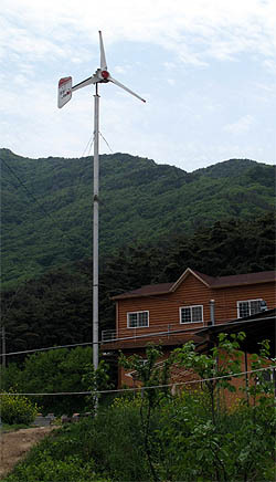 변산공동체 마을에 세워진 풍력발전기 모습. (desk@jjan.kr)