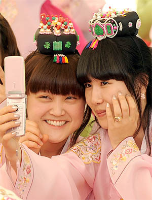 18일 전주향교에서 열린 제37회 성년의 날 성년례(成年禮)에서 성년을 맞은 학생들이 휴대폰을 이용하여 기념촬영을 하고 있다.
