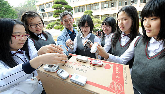 19일 구세군 복지재단의 심장병 어린이 기금마련을 위한 폐휴대폰 수거가 시작되면서 전주근영여고 정진표 선생님과 학생들이 수거함에 휴대폰을 모으고 있다.