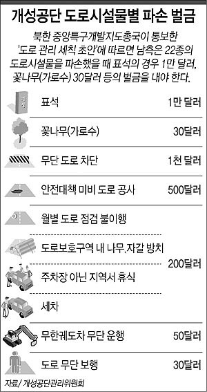총국이 통보한 '도로 관리 세칙 초안'에 따르면 남측은 22종의 도로시설물을 파손했을 때 표석의 경우 1만 달러, 꽃나무(가로수) 30달러 등의 벌금을 내야 한다.