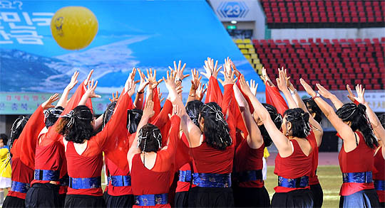 전국 16개 시·도 2만6000여 명의 동호인이 참가하는 '2009 전국국민생활체육대축전' 개막식을 하루 앞둔 21일 오후, 전주종합경기장에서 개회식 식전 행사로 펼쳐질 '현대인의 일상 퍼포머' 공연단이 전북대 최재희 교수의 지도 하에 최종 리허설을 하고 있다.