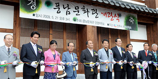 21일 전주 경기전 주차장에서 열린 풍남문화관 개관식에서 참석자들이 기념테이프를 자르고 있다.