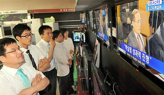 25일 북한 핵실험이 보도가 나가자 전주의 한 가전제품 전문매장에서 시민들이 초조하게 뉴스 특보를 보고 있다.