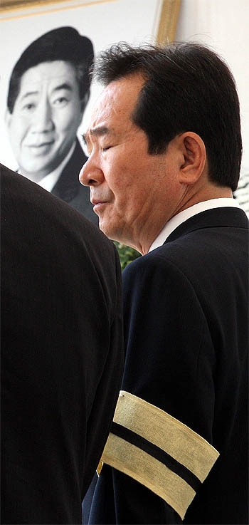 민주당 정세균 대표가 26일 고(故) 노무현 전대통령 공식 분향소가 설치된 서울역 광장에서 슬픔에 잠긴 채 조문객들을 맞이하고 있다.