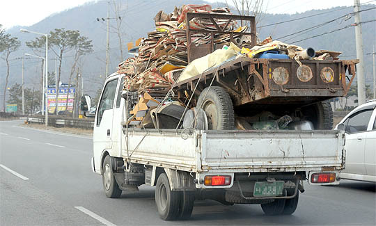 26일 전주~남원 도로에서 1톤 화물차량이 경운기와 짐을 너무 많이 싣고 위험하게 주행하고 있다.