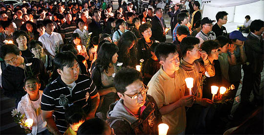 노무현 전 대통령 서거 닷세째인 28일 밤 오거리문화광장에 마련된 분향소에 늦은 시간임에도 불구하고 분향객들이 줄을 잇고 있다.