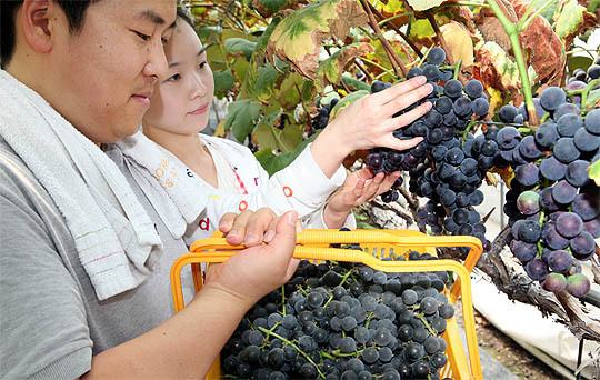 28일 캠벨포도수확으로 한창 바쁜 나날을 보내고 있는 완주군 용진면의 젊은 부부가 하우스포도재배를 하고 있는 부모의 일손을 거들고 있다.