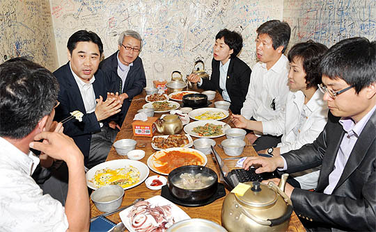 노무현 전 대통령이 서거한지 사흘째 되던 지난 달 25일 오후 7시 30분 전주 서신동 'ㅇ' 막걸리집 구석자리. 본보 독자권익위원 구성은(전주시의원), 권미양(전주 근영여고교사), 김동인(신경정신과 의사), 이근석(전북의제21 사무처장), 최형재(전북도 갈등조정위원회 사무처장)씨와 김은정 편집국장, 안봉주 사진부장, 김성중 정치팀장, 강인석 민생사회팀장, 김준희 기자가 만나 양푼으로 만든 술잔을 주고받았다.