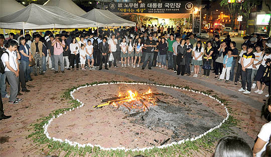 지난달 29일 노무현 전 대통령의 분향소가 차려진 전주 오거리문화광장에서 열린 범도민추모제에서 상여를 태운 자리에 시민들이 하트모양의 국화를 장식하며 고인의 명복을 빌고 있다.