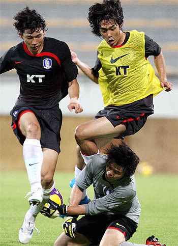 2010 남아공월드컵 아시아지역 최종예선 6차전을 앞두고 1일 오후(현지시간) 두바이 알 와슬 주경기장에서 열린 훈련에서 새벽에 대표팀에 합류한 박주영이 골대를 향해 달려들고 있다.