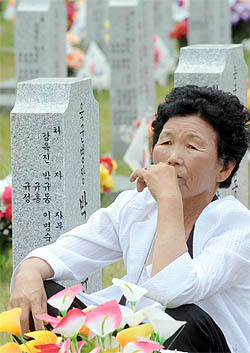 6일 제54회 현충일 맞아 임실 호국원에서 한 유족이 남편을 그리워 하며 깊은 생각에 잠겨 있다.
