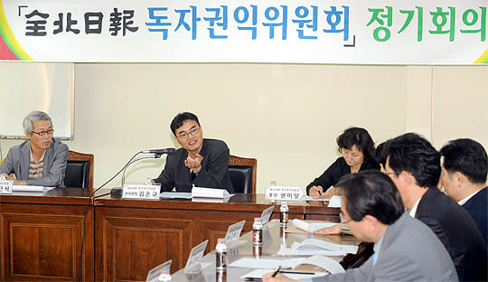 16일 제4기 전북일보 독자권익위원회 제22차 정기회의가 전북일보 7층 회의실에서 열린 가운데 이근석 위원장·김은규 부위원장을 비롯한 위원들이 의견을 나누고 있다.