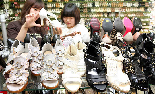 장마가 어느 정도 소강상태를 보인 22일 전주 객사부근의 한 신발매장에서 여대생들이 여름에 시원하게 신을 수 있는 샌들을 살펴보고 있다.