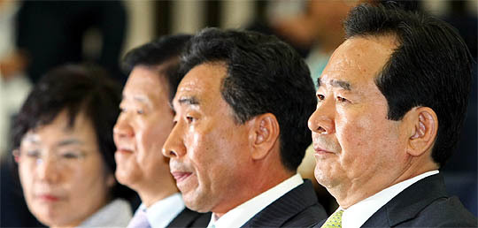 한나라당이 의원총회를 통해 6월 임시국회 단독개원을 추진할 것이라고 알려진 22일 오후, 국회에서 열린 민주당 의원총회에서 정세균 대표와 이강래 원내대표, 박병석 정책위의장, 이미경 사무총장이 굳은 표정으로 동료 의원들의 발언을 듣고 있다.