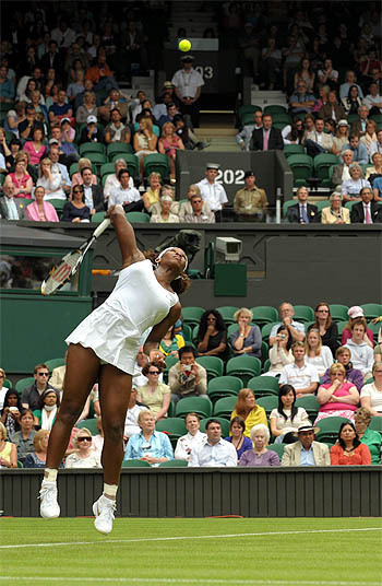 22일(현지시간) 영국 런던에서 열린 '윔블던 테니스 챔피언십'에서 세리나 윌리엄스(미국)가 네우자 실바(포르투갈)를 상대로 강한 스매싱을 날리고 있다.