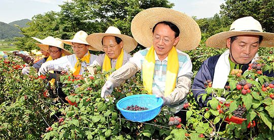 순창군 쌍치면 운암리 복분자 수확현장에서 (우측부터)송영선 진안군수·김완주 도지사·강인형 순창군수·이강수 고창군수를 비롯한 관계자들이 복분자를 수확하고 있다.
