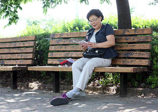 오전 일을 끝낸 중년의 아주머니가 그늘이 드리운 벤치에 앉아 홀로 휴식시간을 갖고 있다.