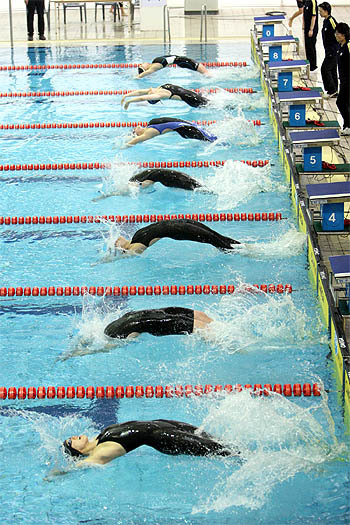 28일 전북 전주 완산수영장에서 열린 제28회 대통령배 전국수영대회 여자 일반부 배영 50m 경기에 출전한 선수들이 힘찬 스타트를 하고 있다.