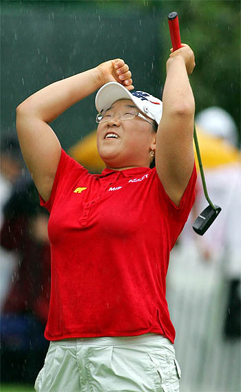 신지애가 6월 29일(한국시각) 미국 뉴욕주(州) 피츠포드의 로커스트 힐 컨트리 클럽에서 LPGA 웨그먼즈 골프 토너먼트 우승후 18번째 그린에서 환호하고 있다.