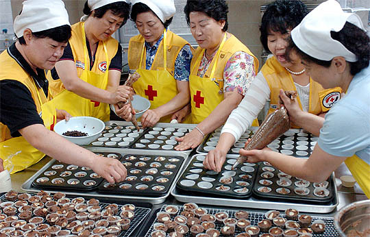 30일 경기도 광주시자원봉사센터에서 대한적십자가 광주청솔봉사회 회원들이 가정 형편이 어려운 어린이들에게 제공할 사랑의 쿠키를 만들고 있다.