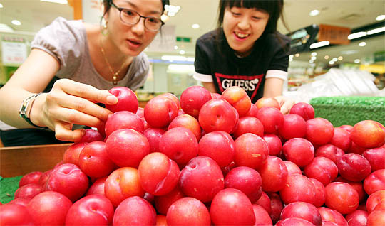 2일 하나로클럽전주점에서 고객들이 새콤달콤한 자두를 고르고 있다. 자두는 간이 좋지않은 사람에게 효과가 있고 변비와 가려움증에도 효과가 있는 것으로 알려져 있다.