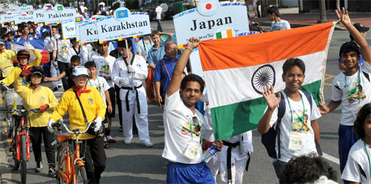 제3회 세계태권도문화엑스포에 참가한 각국 선수단이 개막식에 앞서 전주시내에서 퍼레이드를 하고 있다.