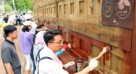 6일 희망근로사업 1일 현장체험에 나선 전주시 관계자들이 아트펜스 설치작업을 벌이고 있다.