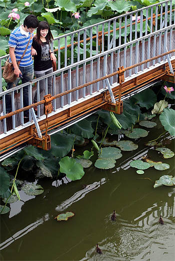 덕진연못에서 한 연인이 오리가족을 보며 즐거워하고 있다.