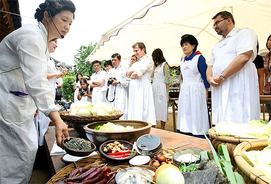 지난 10일 전주 동락원에서 국내 외신기자들이 전통 한식 체험 행사를 하고 있다.
