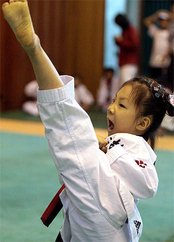 10일 전북 완주군 우석대학교에서 개막한 제7회 우석대 총장기 전국 태권도 품새대회에서 여자 초등학생이 힘차게 발차기를 하고 있다.