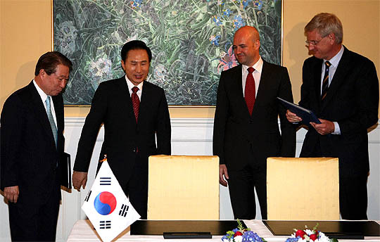 이명박 대통령이 13일 오전(현지시간) 스톡홀름 총리실에서 열린 '한.스웨덴 군사비밀 보호협정' 서명식에 참석하고 있다. 사진 왼쪽부터 유명환 외교통상부장관, 이 대통령, 라인펠트 스웨덴 총리, 칼 빌트 외교장관.