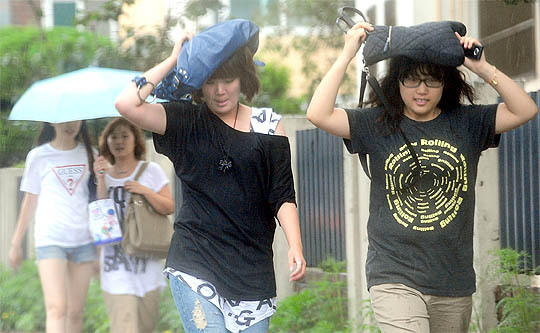 장마전선의 영향권에 들어 흐리거나 비오는 날씨가 이어지는 가운데 13일 오후 소나기가 내리자 학생들이 가방으로 머리를 가린채 달리고 있다.