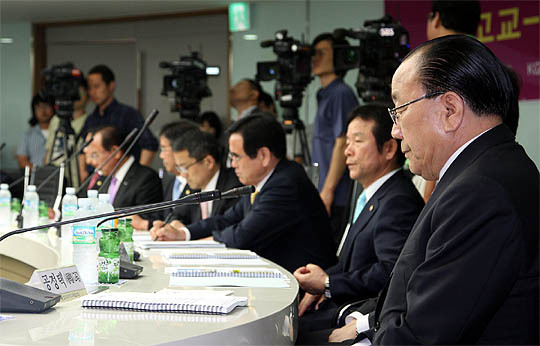 13일 서울 상암동 한국대학교육협의회 대회의실에서 열린 고교-대학 연계워크숍에서 공정택 서울시교육감 등 참석자들이 이배용 대교협 회장의 인사말을 듣고 있다. 이날 워크숍은 공교육 신뢰회복 및 사교육비 경감 등 고교-대학간 협력강화를 위해 열렸다.