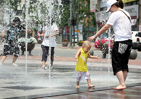 한낮의 더위를 피해 시원하게 분수의 물줄기를 맞으며 놀고있는 천진난만한 아이와, 아이와 놀아주는 엄마는 참 행복하다. 멀리 바다로만 가야 꼭 피서인가.