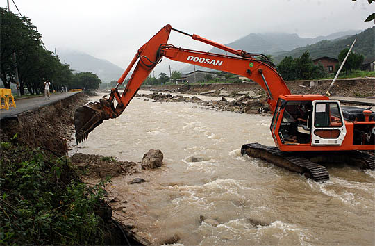 15일 새벽 전북 완주에 내린 폭우로 소양면 황운리 오도천 일부가 범람하고 제방이 무너져 내려 벚꽃나무 10여 그루가 유실됐다.
