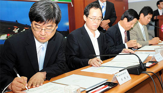 15일 전주시청에서 열린 전주 생물생명산업 육성을 위한 상호협약식에서 참석자들이 협약서에 사인을 하고 있다. 왼쪽부터 권태호 전주생물소재연구소장, 송하진 전주시장, 신재철 LG CNS대표이사.