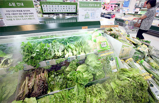 장마로 인해 농작물이 피해를 입고있는 가운데 쌈채소류의 가격이 올라 한 대형마트에서 시민이 쌈채소류 판매대 앞을 무심히 지나가고 있다.