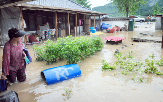 16일 새벽에 내린 집중호우로 전주시 색장동 안적마을이 침수되어 마을 주민이 급하게 집을 빠져 나오고 있다.
