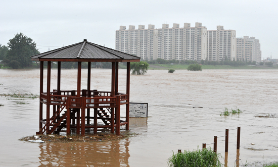 전주천과 삼천이 합류하는 전주 이편한세상 아파트 앞 천변에 불어난 물이 산책로를 덮쳐 팔각정만 모습을 드러내고 있다.
