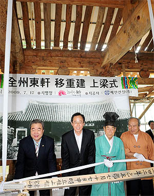 17일 전주 교동 한옥마을에서 열린 전주부 동헌 상량식에서 참석자들이 마룻대를 들어올리고 있다.
