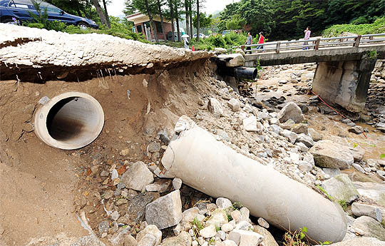 집중호우로 하천 유실 등 피해가 발생한 전주시 중인동 중인천에서 20일 복구작업이 이뤄지고 있지만 안전사고 위험이 큰 일부지역은 피해복구는 커녕 위험 안내 표지판도 설치돼 있지 않다.