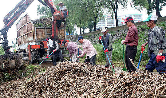 21일 전주 서신교부근 천변에서 희망근로 참여자들이 지난 장맛비로 인해 떠내려온 부유물을 제거하고 있다.