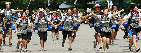 제12회 대학생 국토대장정을 완주한 대학생들이 21일 오후 여의도 광장으로 뛰어 들어오고 있다. 행사를 주최한 동아제약은 지난 1일 전남 해남을 출발해 총 566.3km의 거리를 144명 중 142명이 완주했다고 전했다.