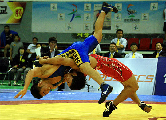 21일 강원 태백시 고원체육관에서 열린 양정모 올림픽 제패 기념 제34회 KBS배 전국 레슬링 대회 일반부 그레코만형 55㎏급 결승전에서 경남대 방성철 선수와 상무 김상래(청색유니폼) 선수가 한판 승부를 벌이고 있다.