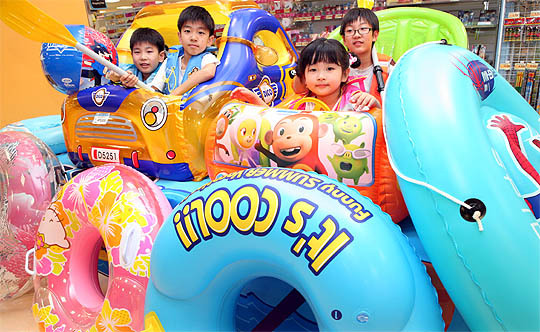 무더위가 시작되는 피서철이 다가오면서 27일 롯데마트전주점에서 아이들이 전시되어있는 물놀이용 보트를 타고 즐거워하고 있다.
