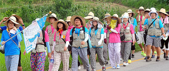 21C한국대학생연합 통일국토대장정에 참가한 학생들이 27일 정읍을 출발, 전주 평화동길을 걷고 있다.