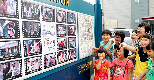 28일 전주시 영상정보과에서 추진하는 영화문화체험 투어에 참가한 전주 덕진구 관할 지역아동센터 아이들이 전주 영화종합촬영소에 설치된 전주지역에서 주요 로케이션 촬영지 안내판을 보고 있다.