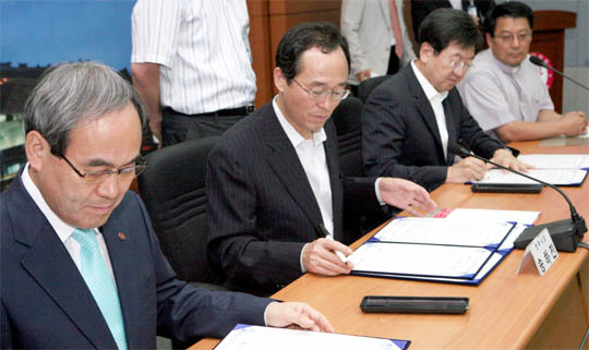 온실가스저감 및 탄소중립실천을 위한 MOU체결식에서 참석자들이 사인을 하고 있다. 왼쪽부터 서거석 전북대총장, 송하진 전주시장, 이남식 전주대 총장.