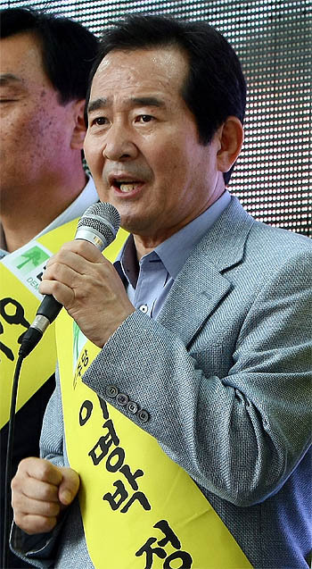 정세균 민주당 대표가 30일 경기도 성남 단대오거리에서 열린 언론악법원천무효 거리홍보행사에서 시민들에게 언론악법 저지 투쟁에 대한 지지를 호소하고 있다.