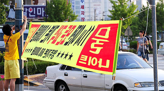 30일 오후 전주시내 한 거리에서 불법 현수막을 달고 있다. 불법 현수막은 단속에 걸리지 않게 오후 늦게 부착했다 다음날 새벽에 다시 떼어내고 있다.
